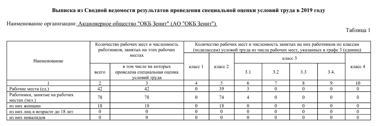 Выписка из Сводной ведомости результатов проведения специальной оценки условий труда в 2019г.