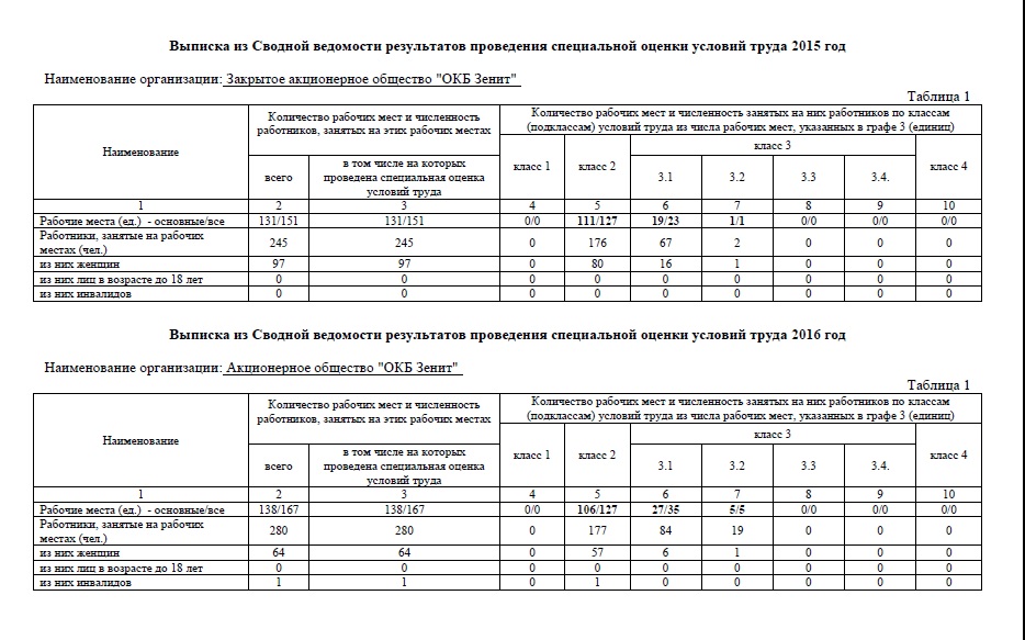 Выписки из Сводной ведомости специальной оценки условий труда за 2015-2016гг.