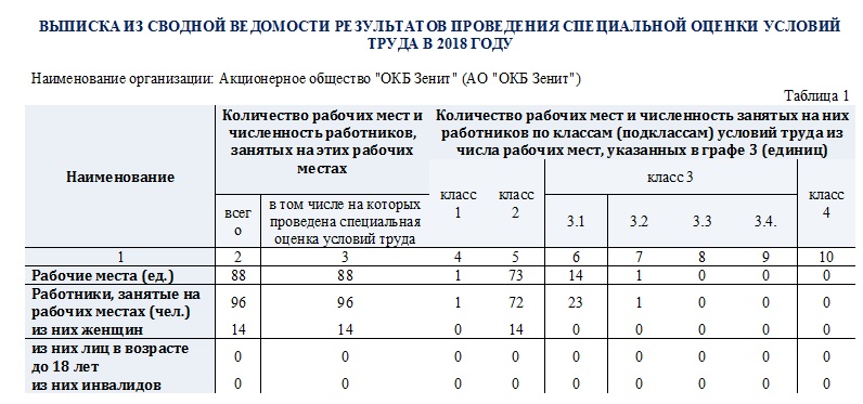 Выписка из Сводной ведомости результатов проведения специальной оценки условий труда в 2018г.