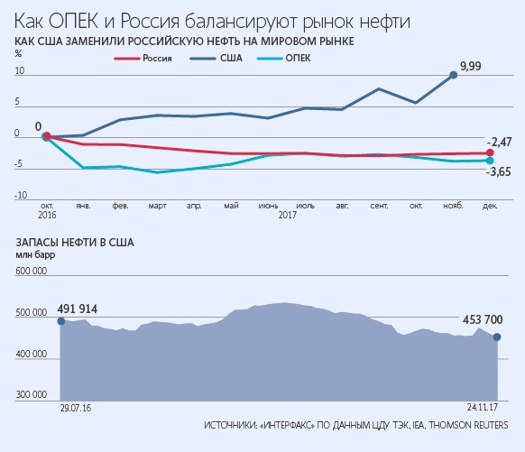 Сделка начала действовать в январе 2017 г. За год цена на нефть выросла на четверть и достигла $69,05/барр., запасы нефти в хранилищах США сократились до 412,7 млн барр., приблизившись к средним показателям за предыдущие пять лет. Для сравнения: в марте 2017 г. американские запасы достигли рекордных с 1982 г. 533 млн барр.