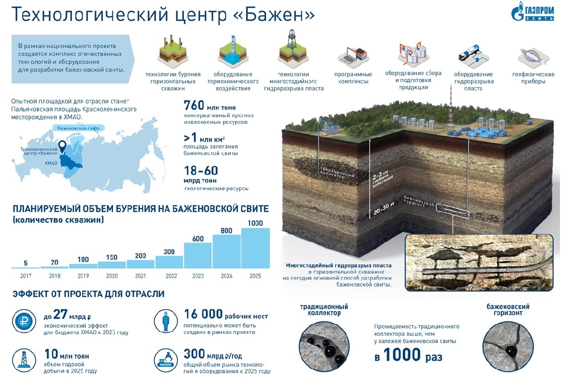 «Газпром нефть» создала в Ханты-Мансийском автономном округе дочернее общество ООО «Технологический центр Бажен», главной задачей которого станет формирование комплекса коммерчески эффективных российских технологий для освоения баженовской свиты.